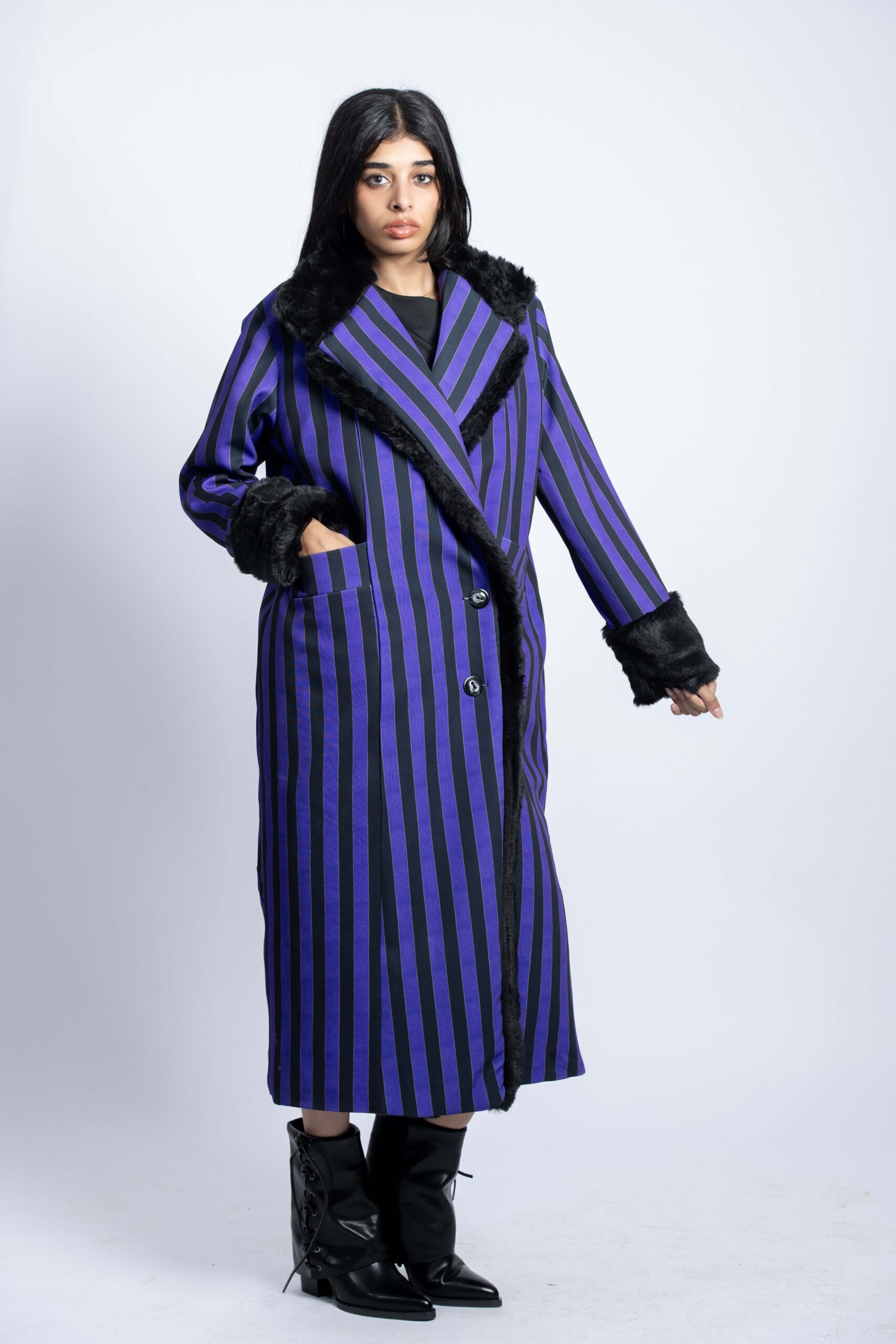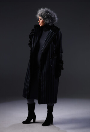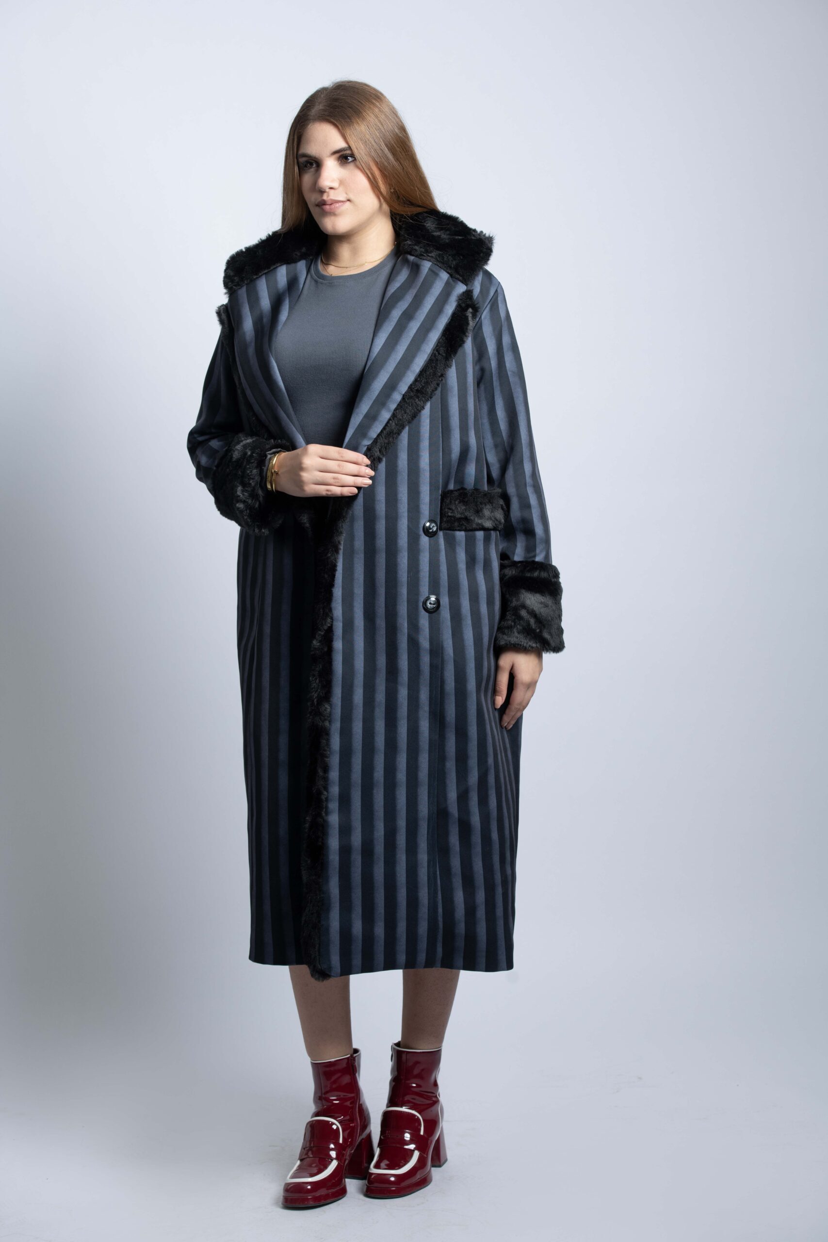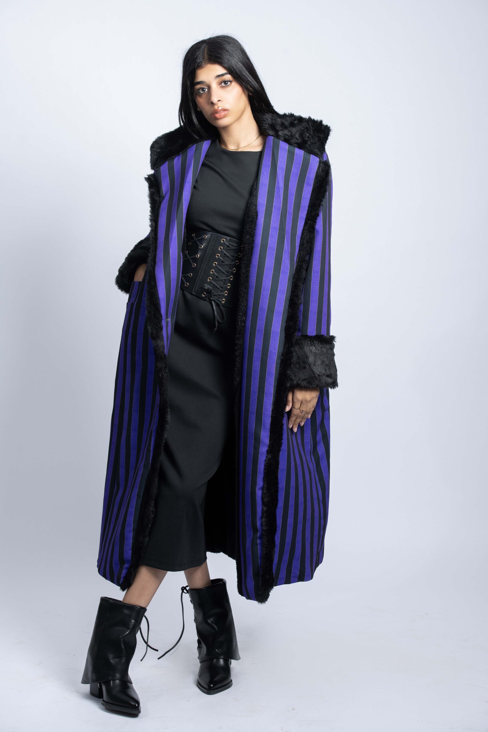 a long coat with a fur collar and fur trimmed sleeves , vertically striped and lined with fur .