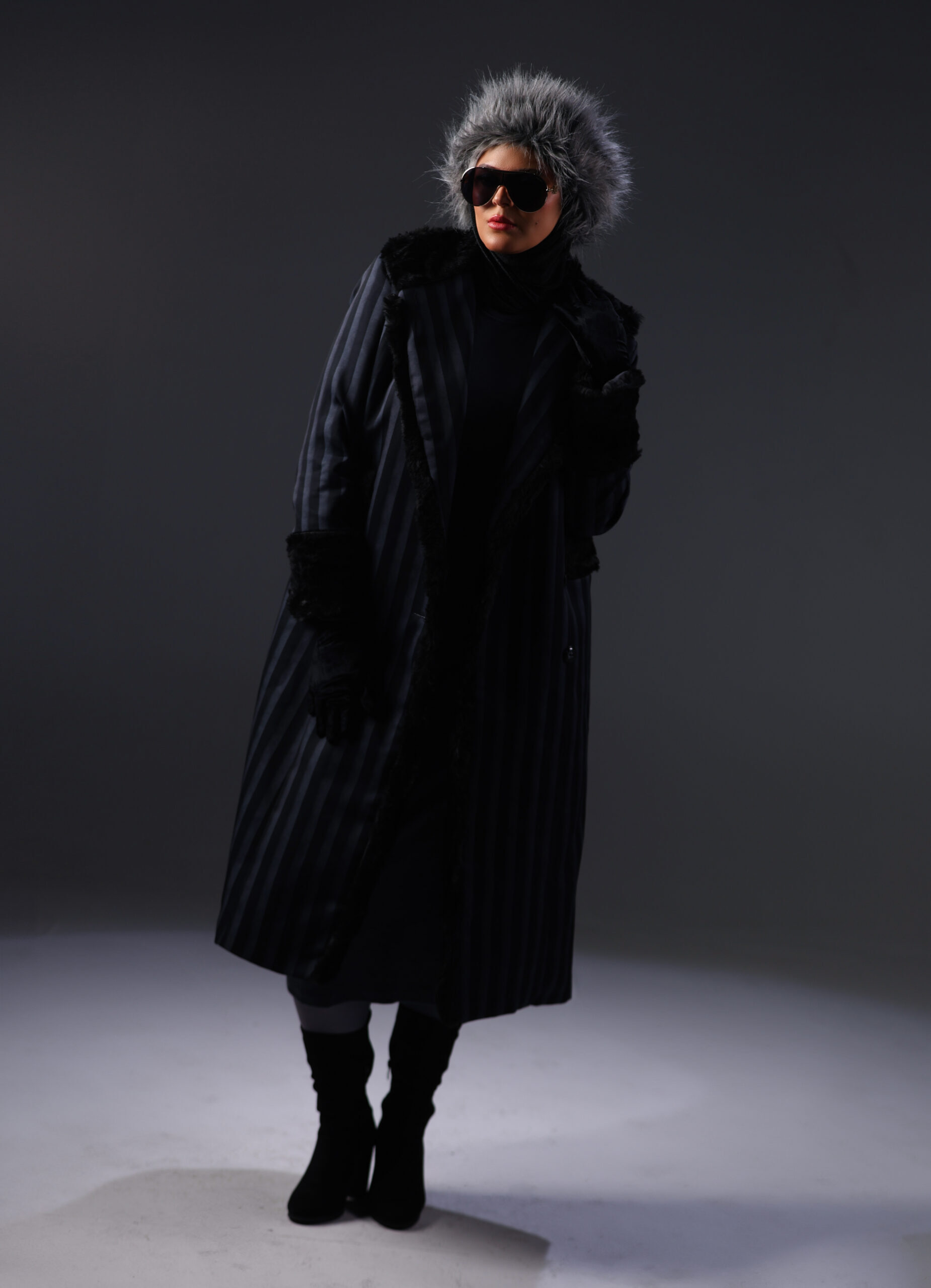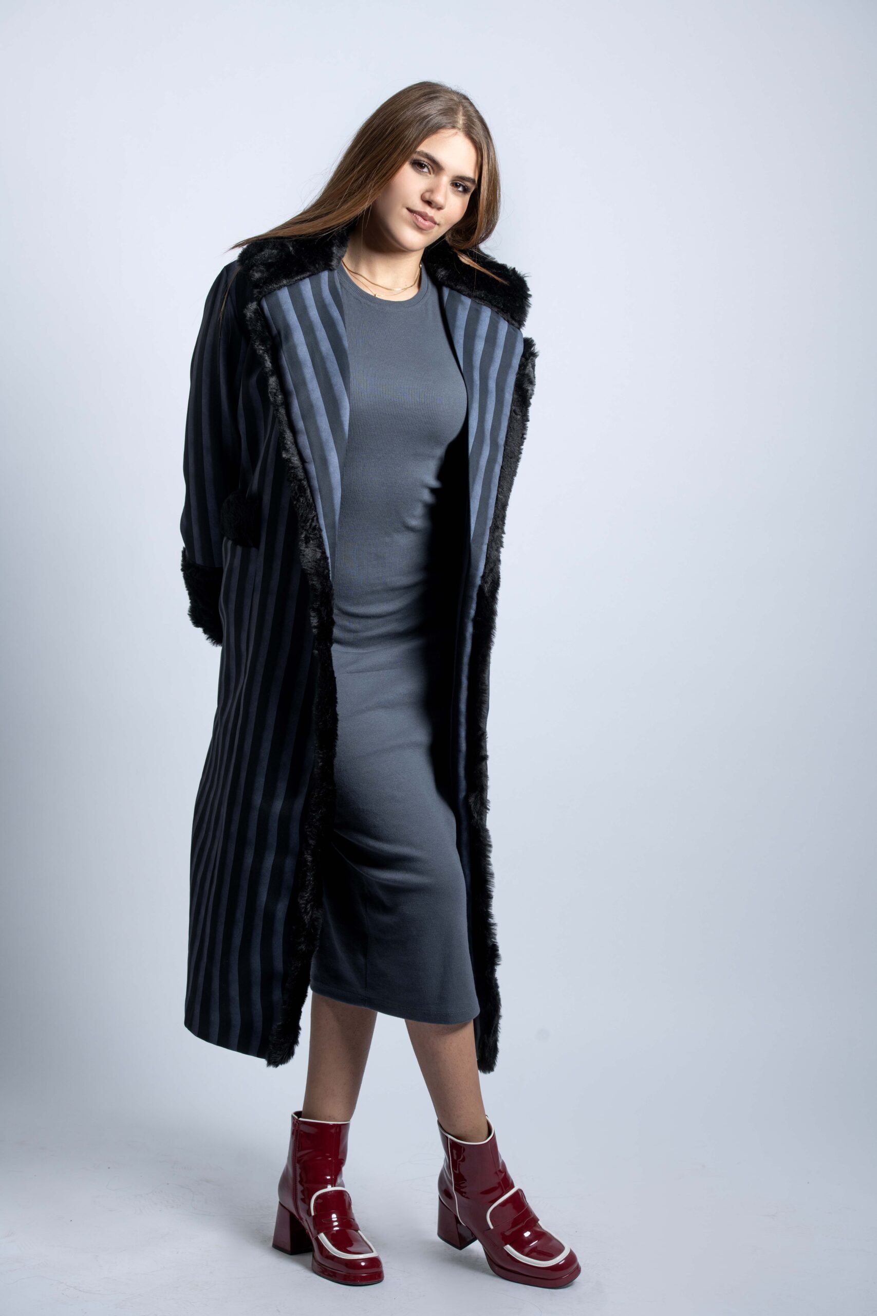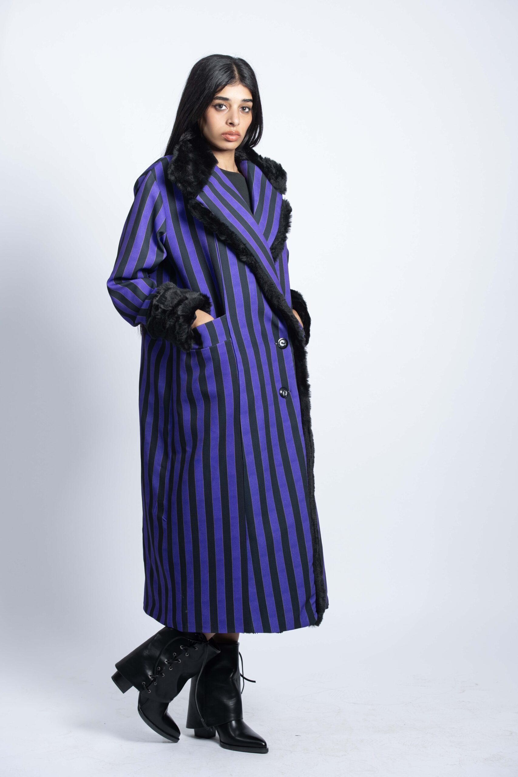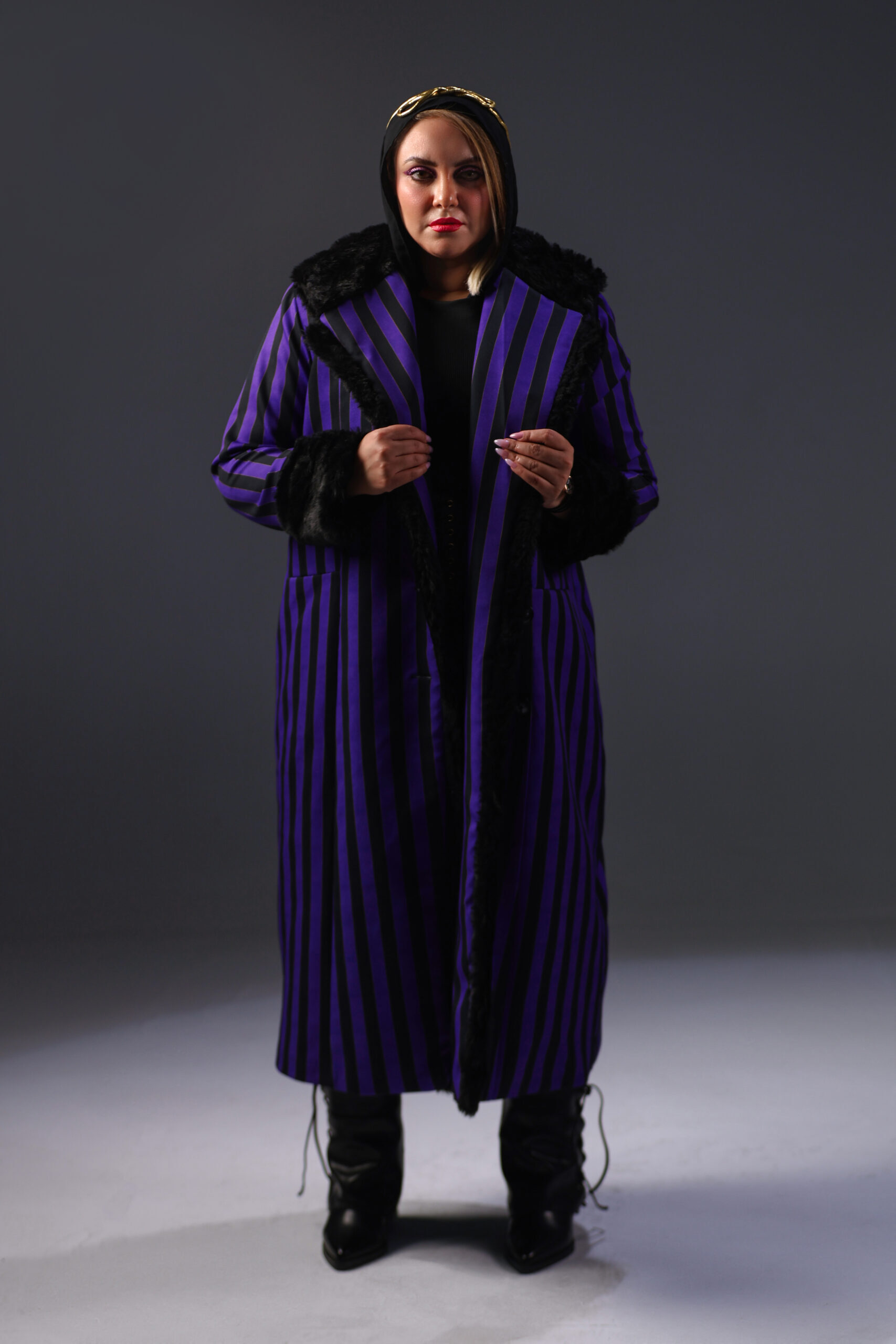 a long coat with a fur collar and fur trimmed sleeves , vertically striped and lined with fur .