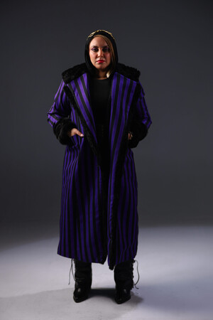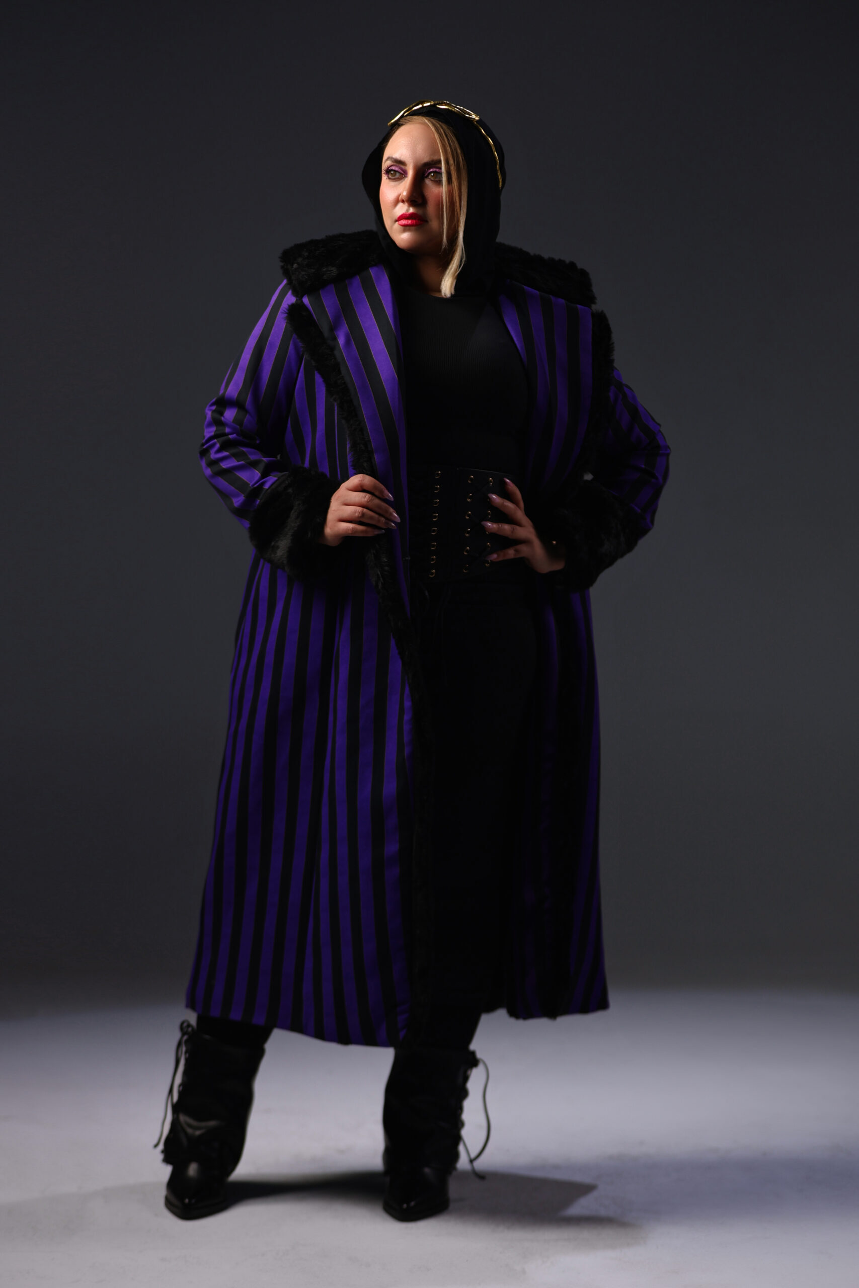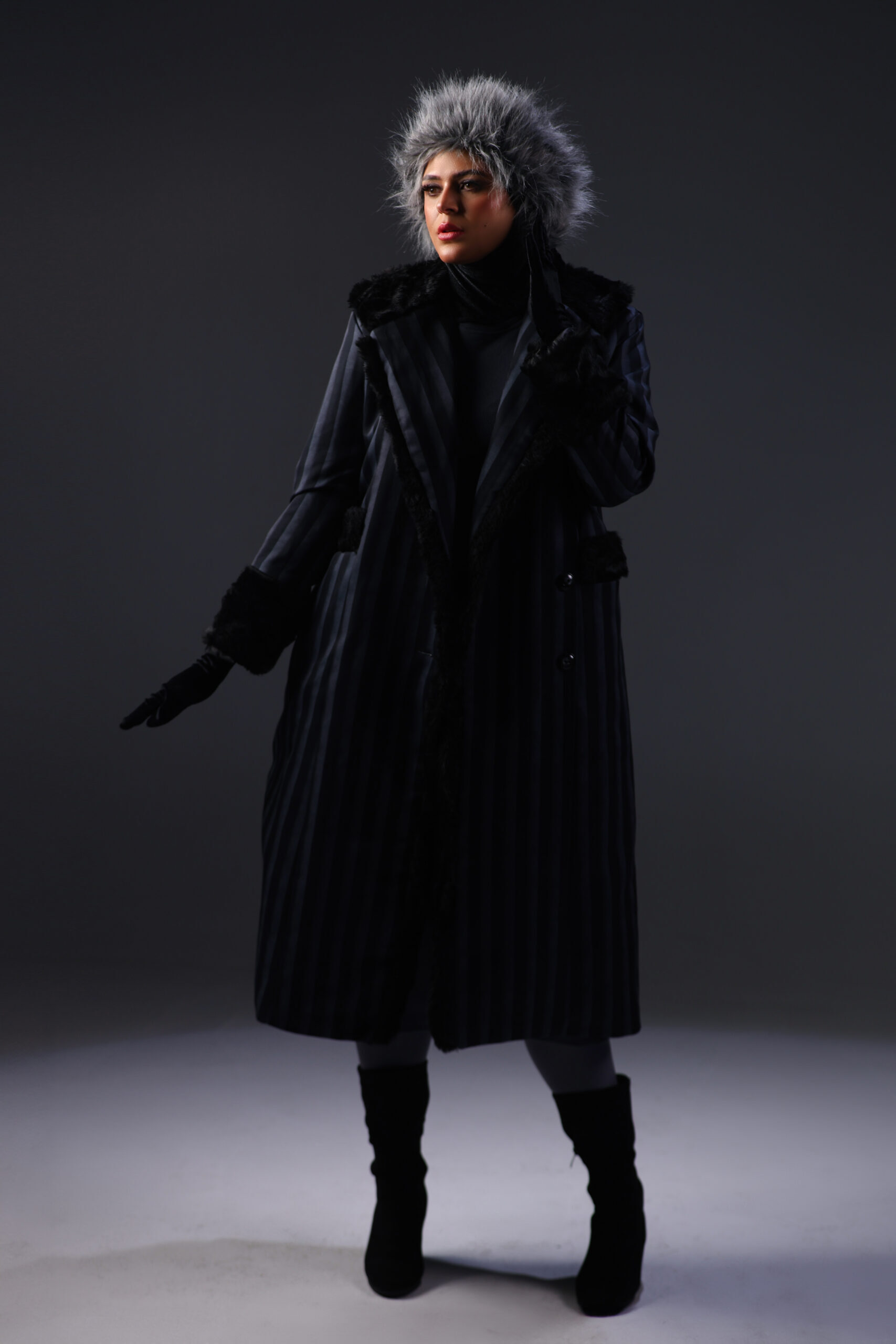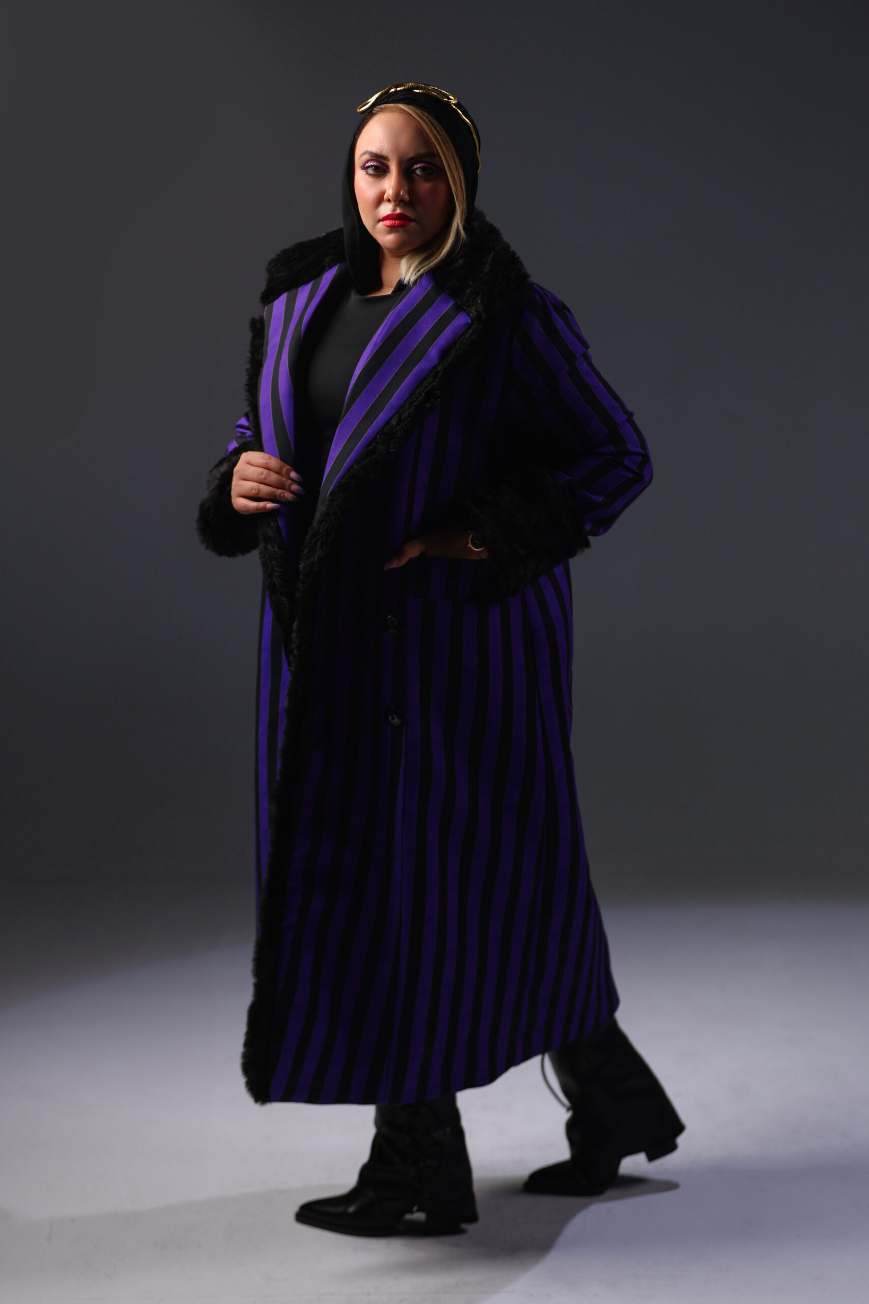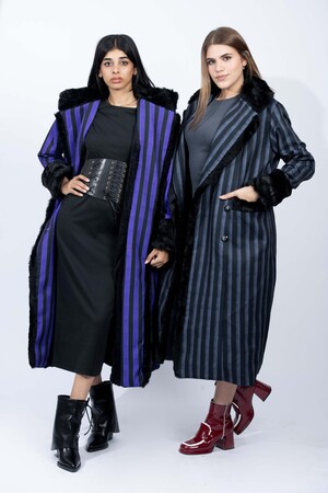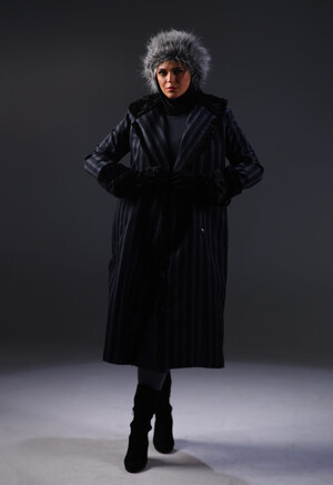 a long coat with a fur collar and fur trimmed sleeves , vertically striped and lined with fur .